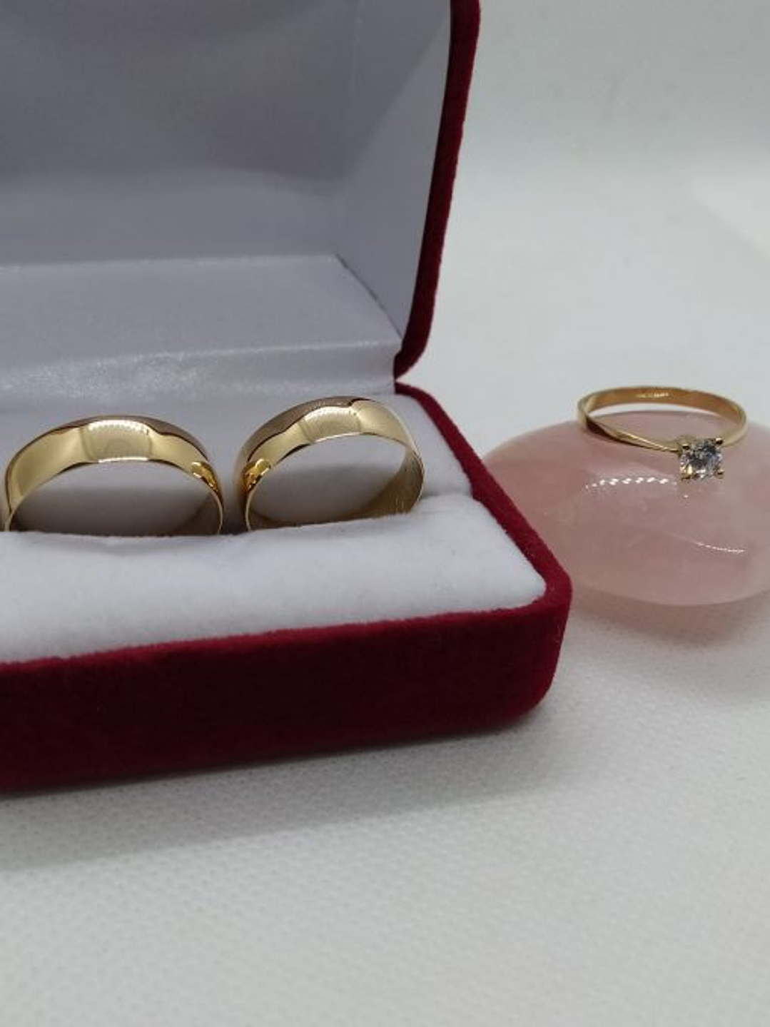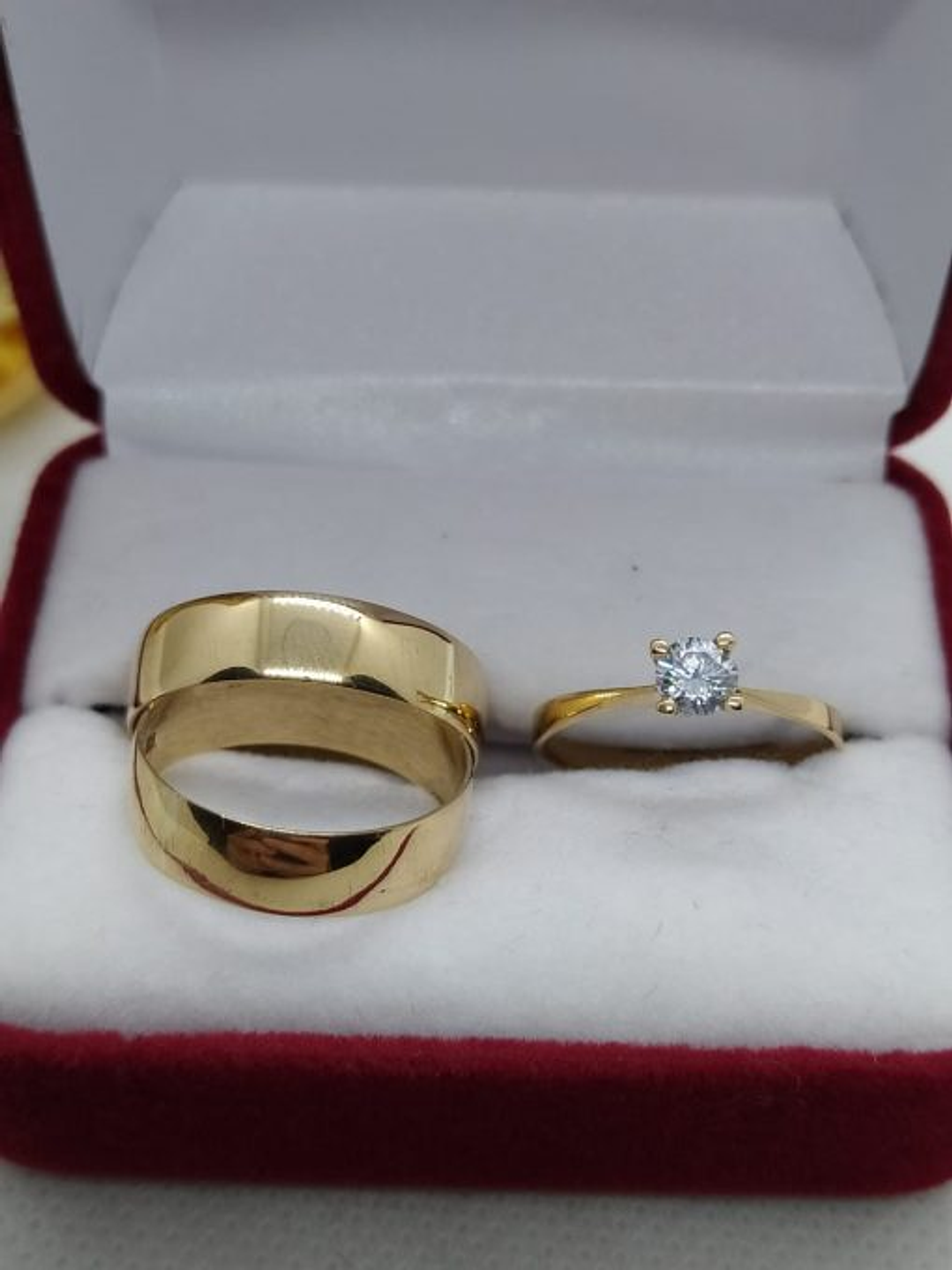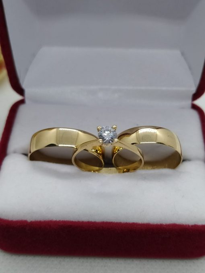 Nuestras argollas de matrimonio media caña 5 mm de oro 18k más anillo de compromiso solitario circón de oro 18k son el regalo perfecto para su pareja. Son una declaración de amor eterno y estarán contigo por el resto de tu vida. Haga su pedido hoy y comience a crear recuerdos que durarán toda la vida.