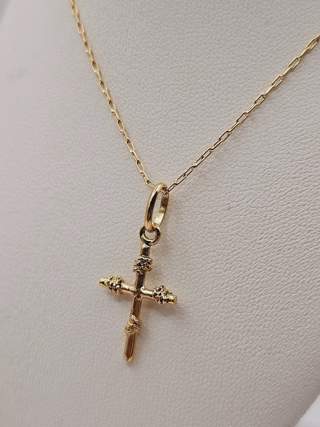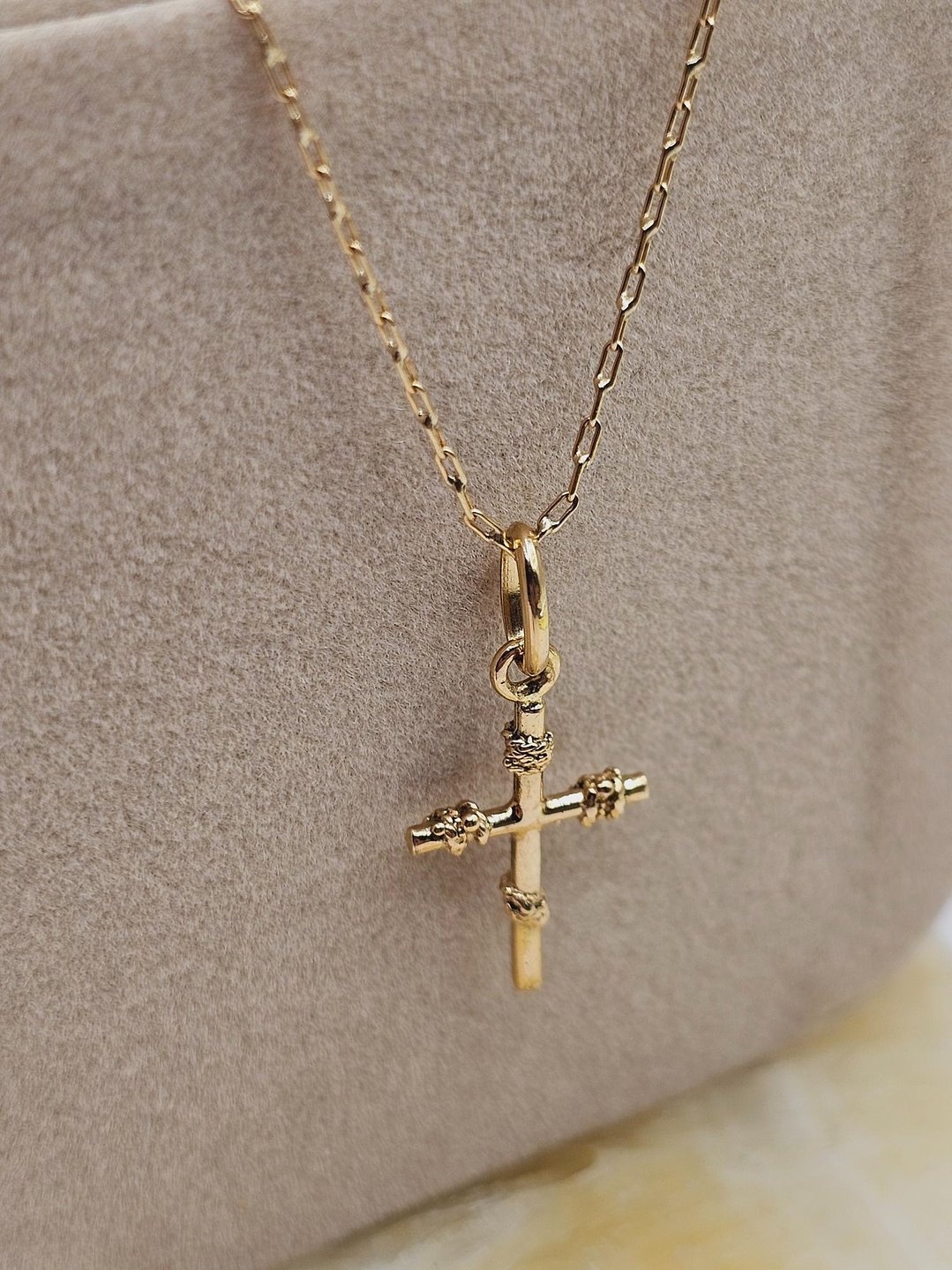 - Colgante Cruz con Amarras (25 mm): El diseño lineal de la cruz se complementa con un patrón detallado que le da un aire contemporáneo y versátil. Su estilo, con sus "amarras" entrelazadas, es un acento perfecto para un look moderno. 💎