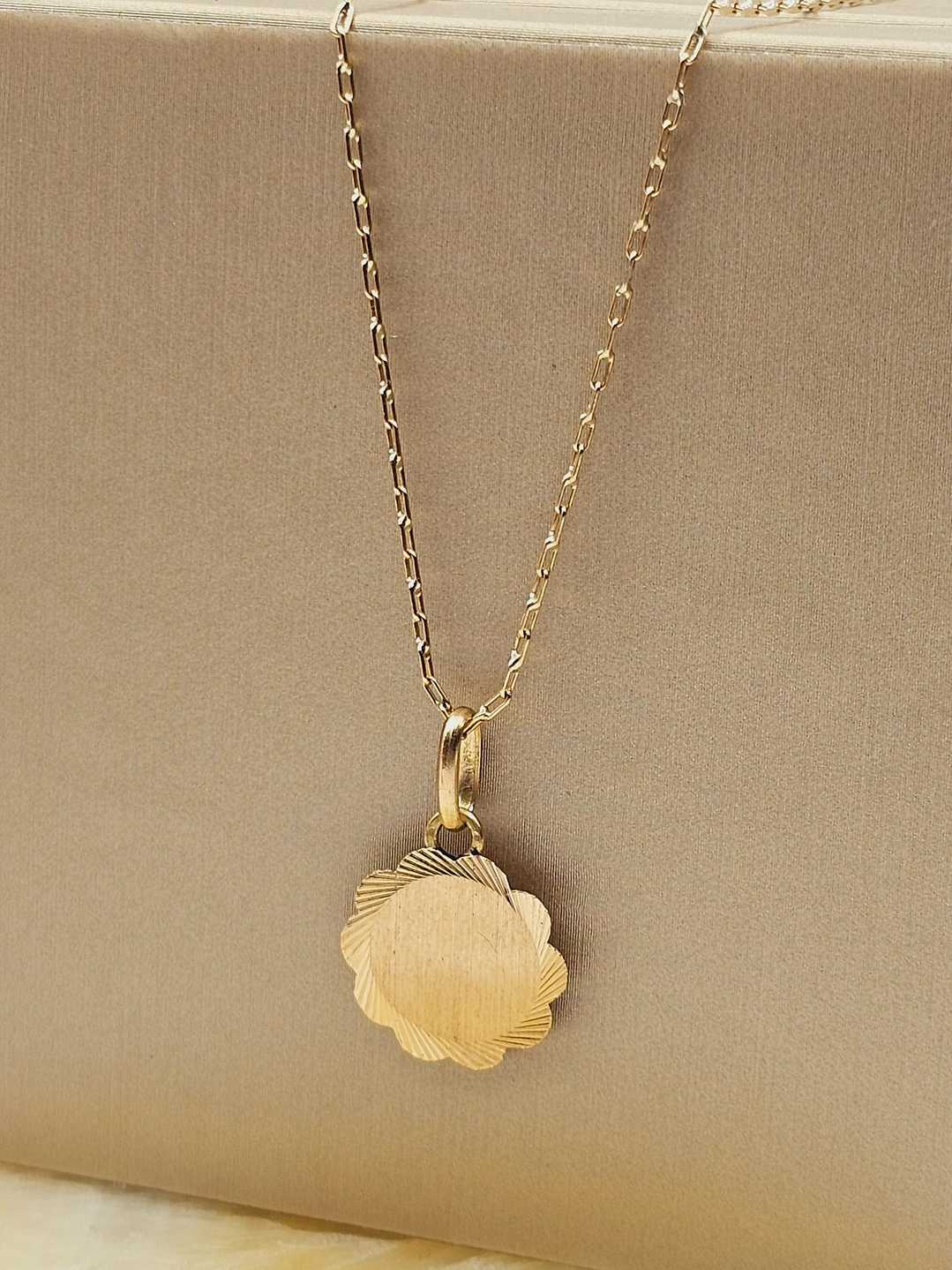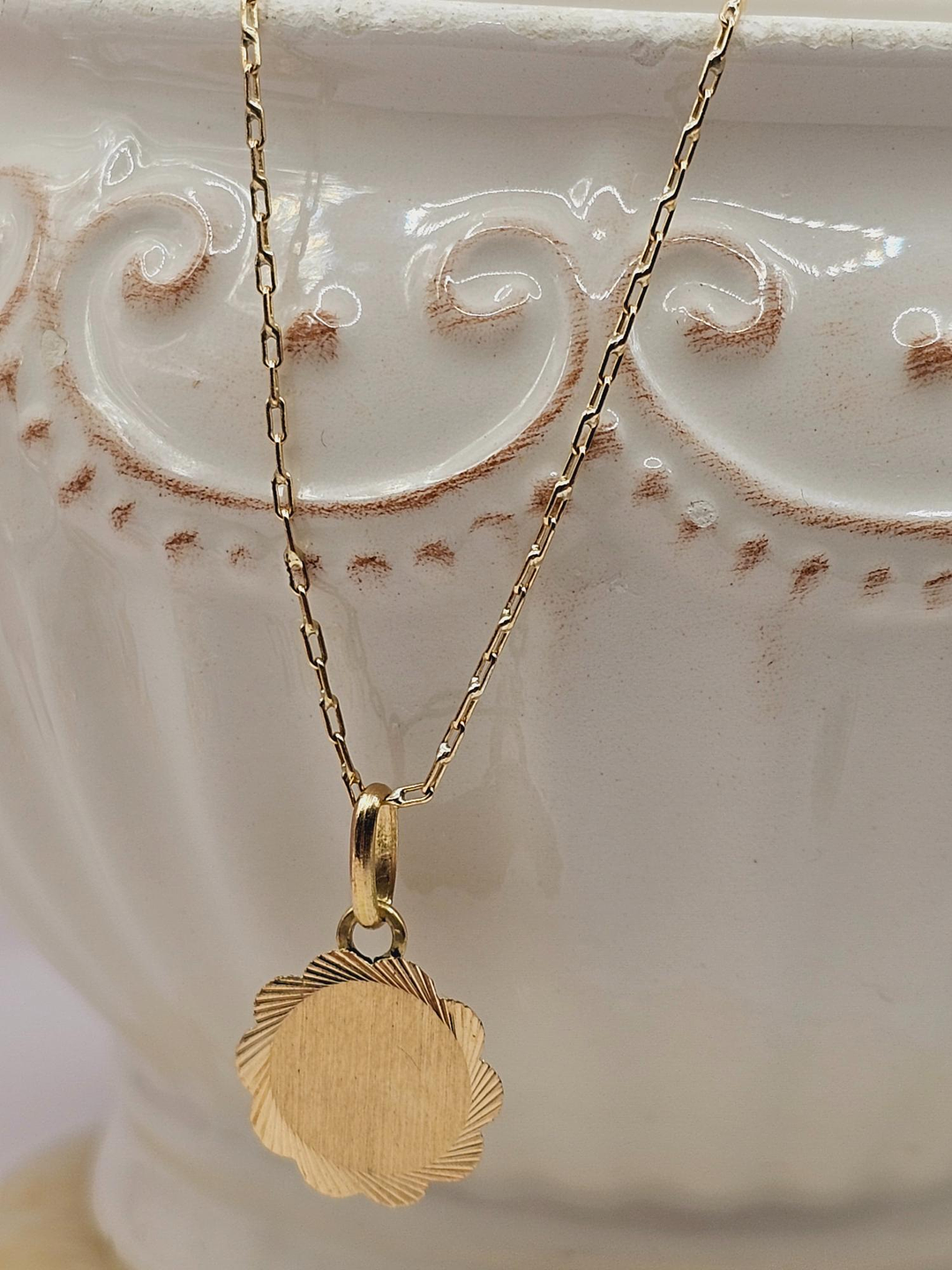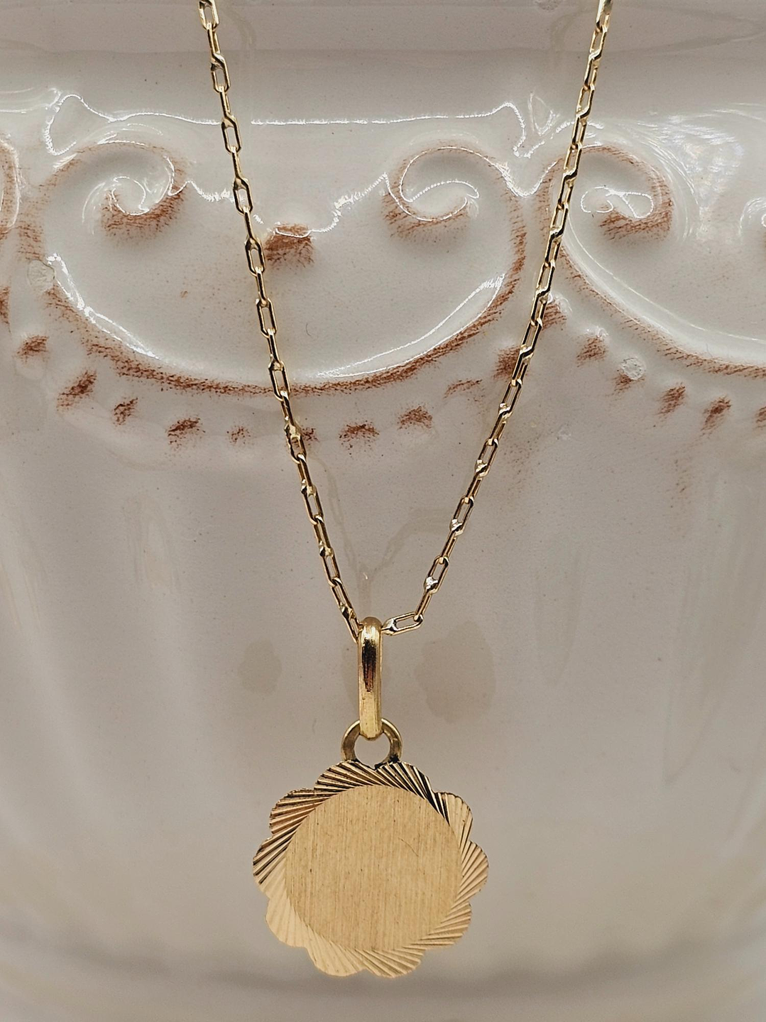 Versatilidad para cualquier ocasión: La cadena de 50 cm de largo, elaborada con eslabones limados de oro de 18 quilates, es fina y delicada, perfecta para llevarla sola o con el disco flor. Su versatilidad te permite combinarla con diferentes atuendos, desde un vestido elegante hasta un look más casual.
