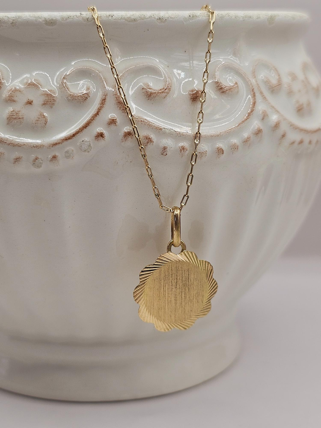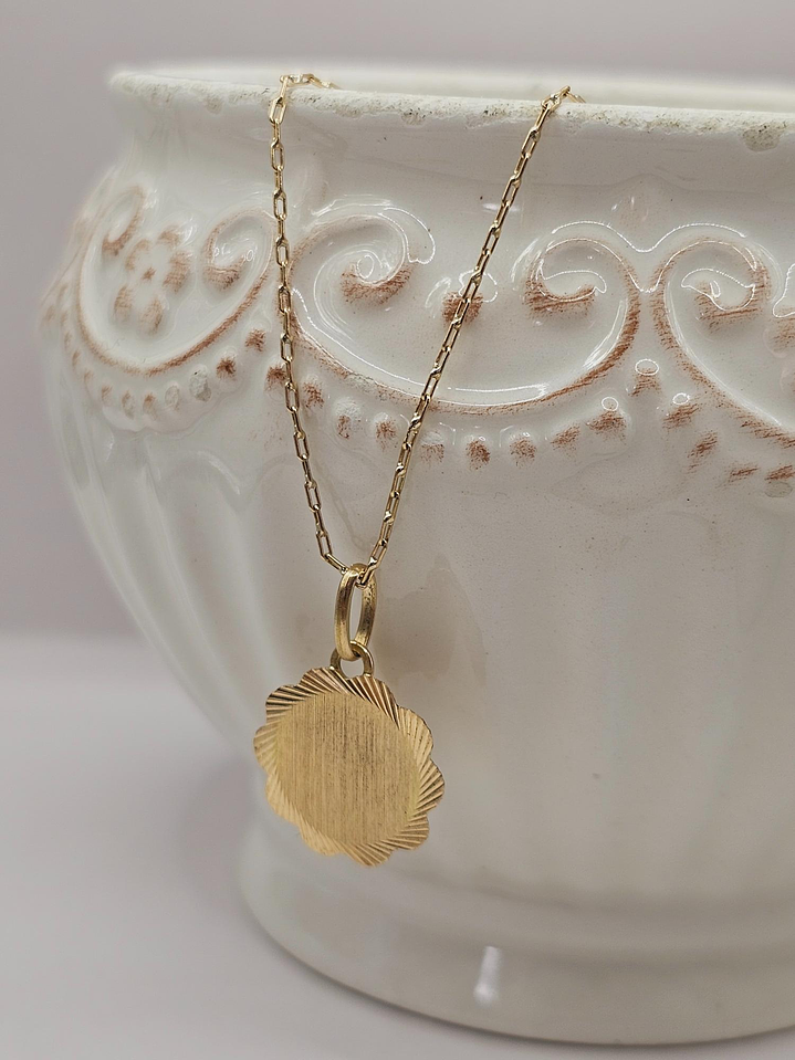Cadena limada 60 cm y colgante disco flor 17 mm 3.4 grs Oro 18k
