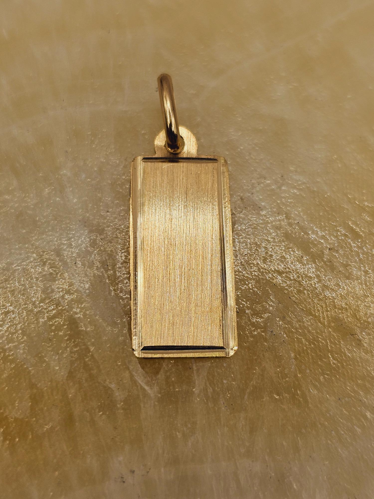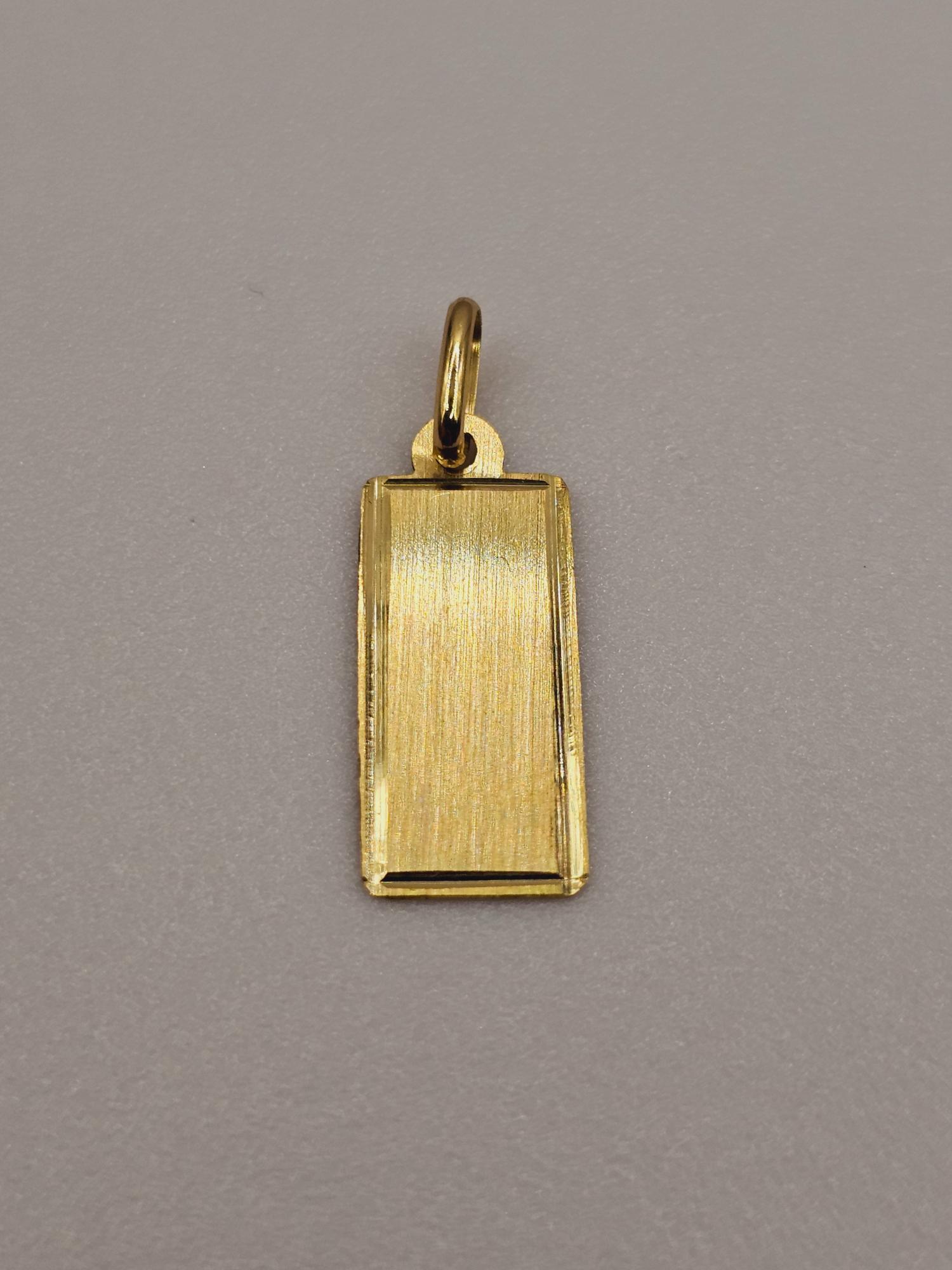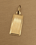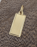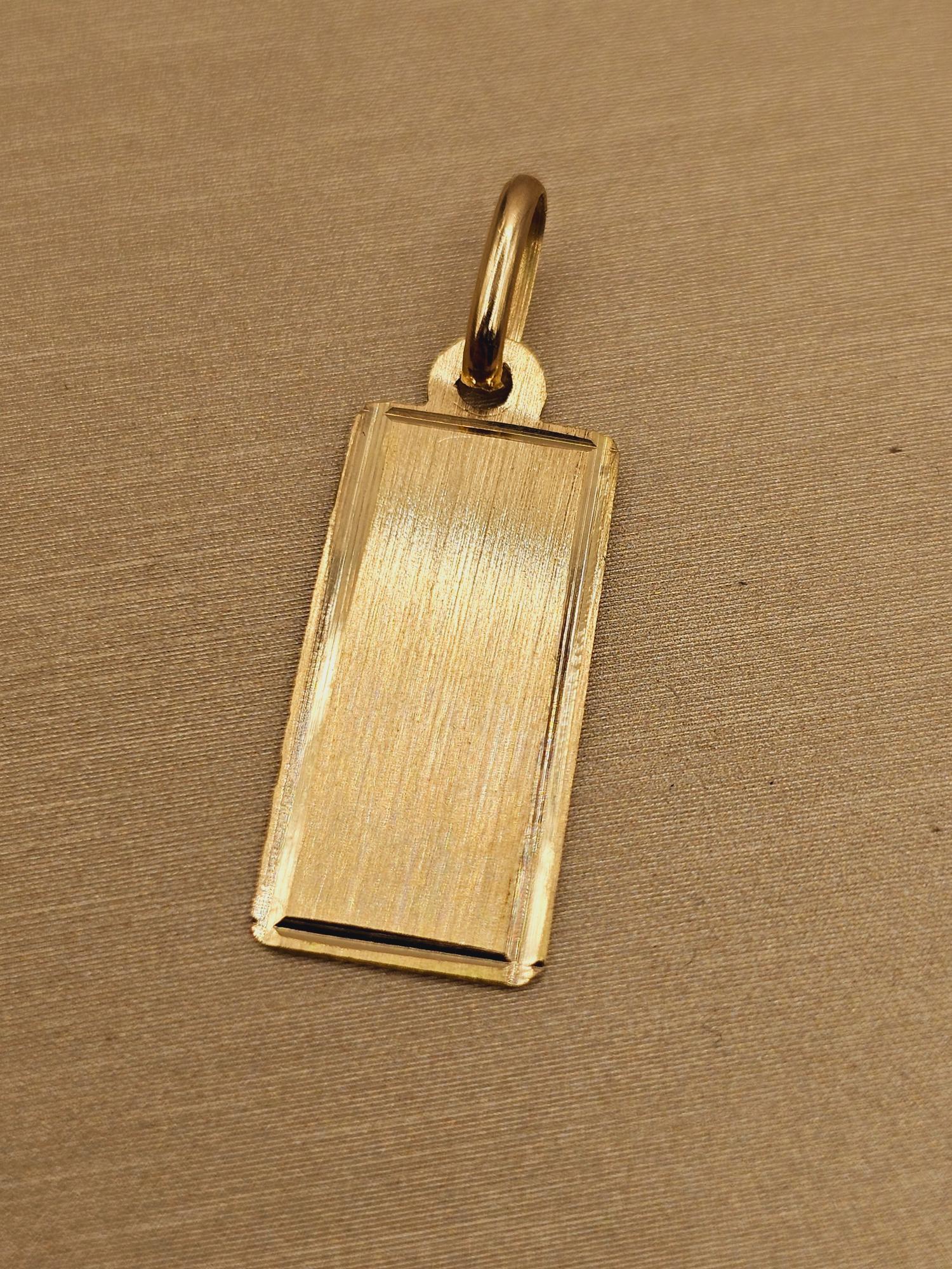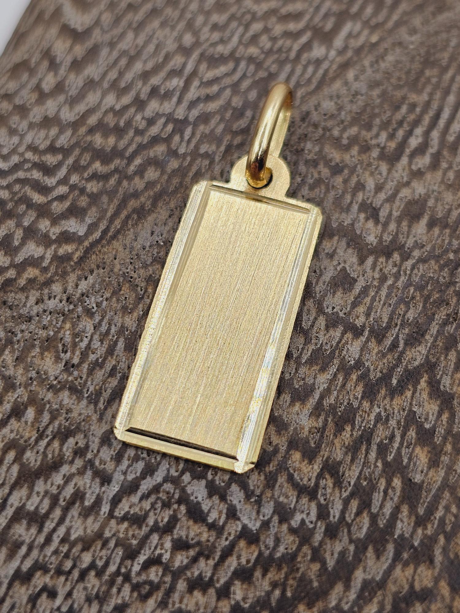 Elaborado con materiales de la más alta calidad, este colgante te garantiza durabilidad y resistencia al deslustre. La placa rectangular está hecha de oro de 18 quilates, un metal precioso conocido por su brillo excepcional y su valor en el tiempo. Con un largo de 27 mm, un ancho de 10 mm y un peso aproximado de 1.2 gramos, este colgante es ligero y cómodo de llevar, permitiéndote lucirlo todo el día sin sentir molestias.