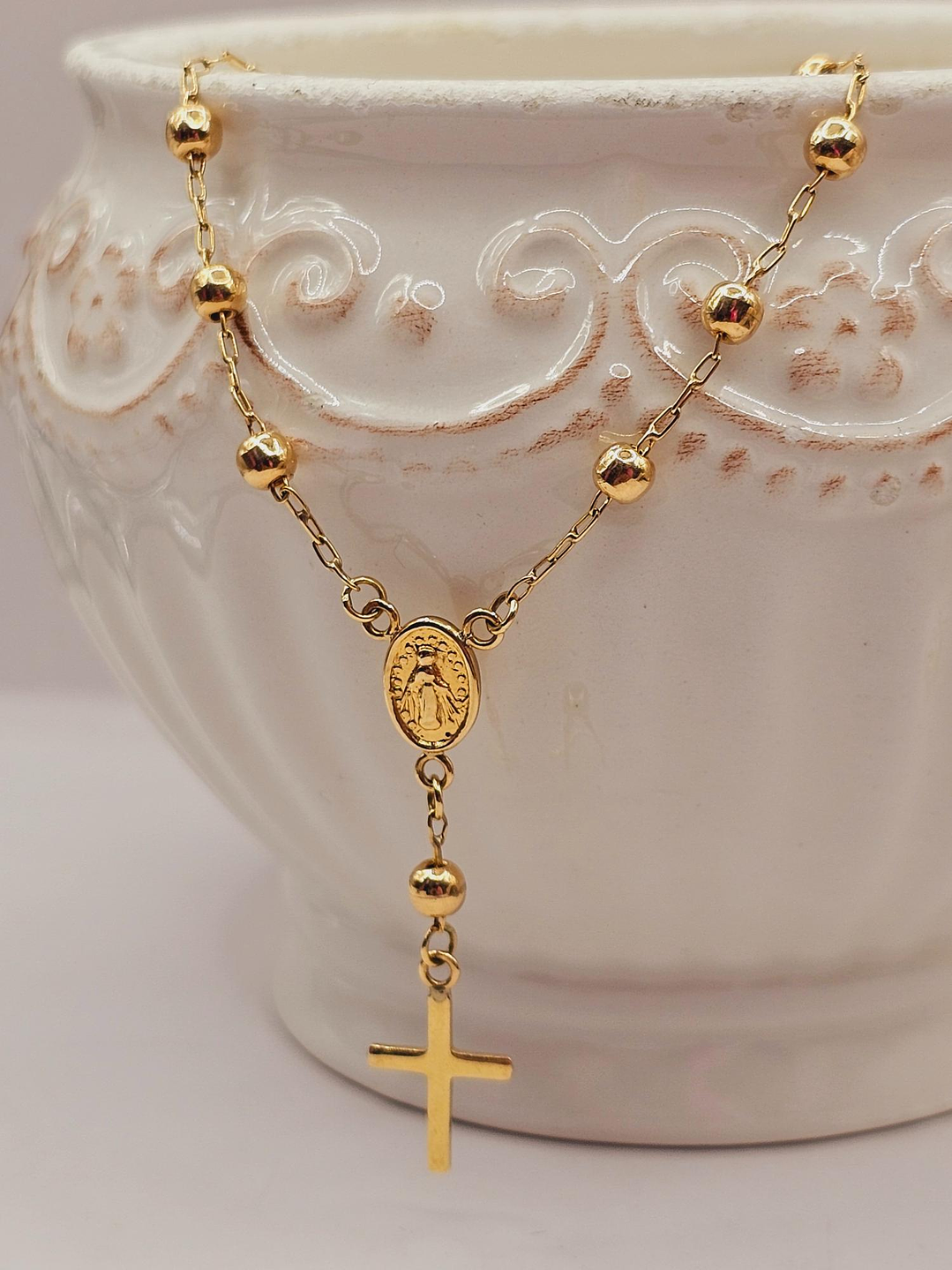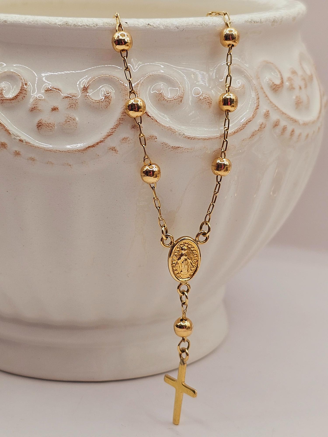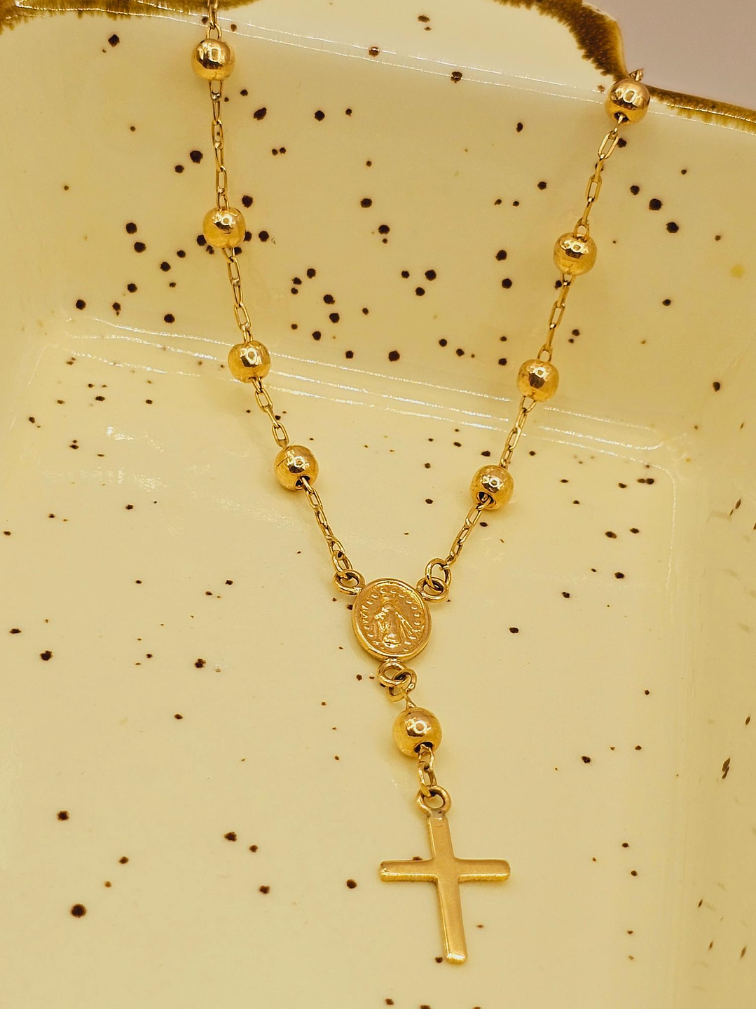 - Diseño Denario Clásico: Las delicadas cuentas de oro y la cruz tradicional crean un diseño armonioso y elegante. 🌟 La pulsera está pensada para llevarse a diario, aportando un brillo sutil y constante.